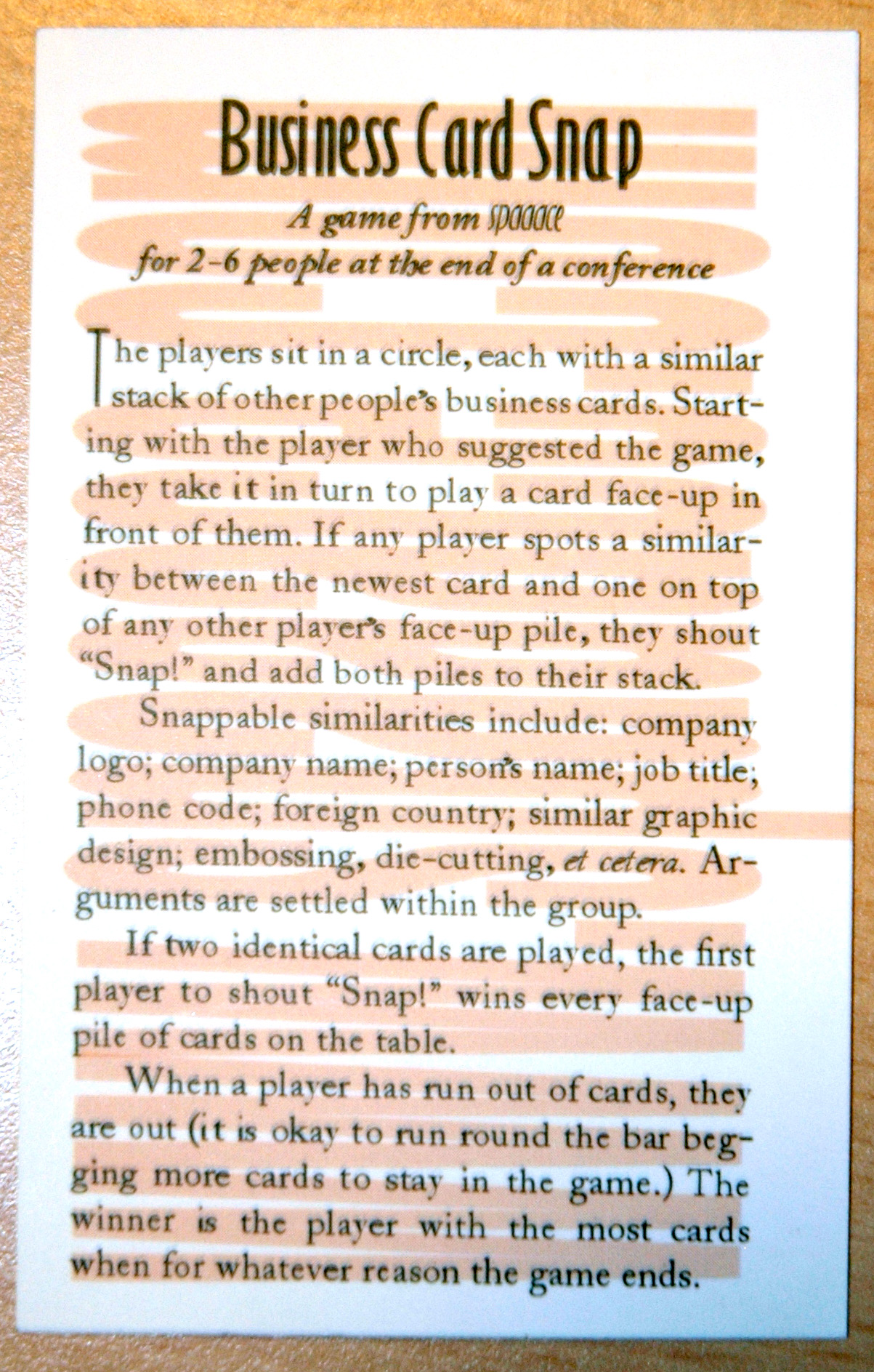 James himself had a great example of this – right on the back of his business card. It’s a game called business card snap, and the rules are on the right (the pic gets bigger if you click on it).