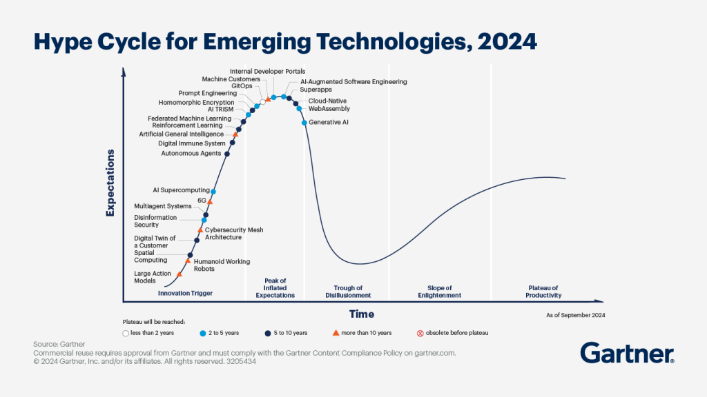 The Gartner Hype Cycle for 2024 has GenAI sliding down the trough of disillusionment and AGI not far off the peak.