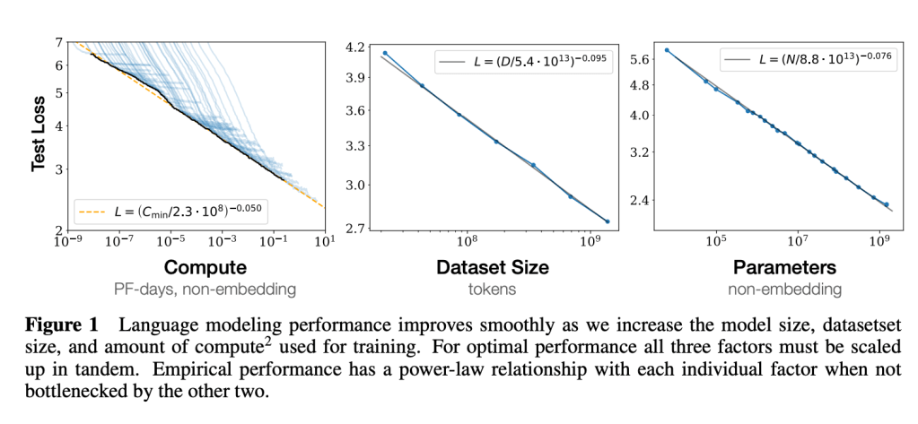These graphs show how test loss decreases smoothly and predictably as you scale up inputs to creating AI models. Note though, that the x-axis on those graphs isn’t linear. It’s exponential. Each step to the right involves a 10x increase in compute, dataset, or parameters.